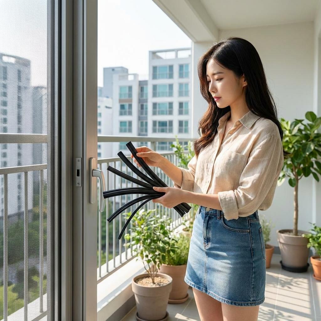 셀프 작업 시 가장 많이 하는 실수가 고무 두께를 잘못 사는 것입니다. 기존 틀에 끼워져 있던 가스켓을 1cm 정도 잘라 지참하신 후, 동일한 두께나 0.5mm 정도 더 두꺼운 것을 선택해야 방충망 셀프교체 후 망이 헐거워지지 않습니다.