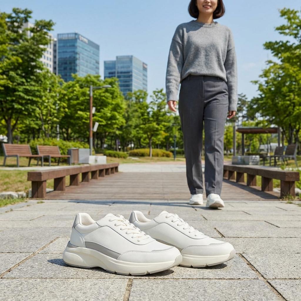 운동화를 고를 때 가장 신경 쓰이는 것이 뒤꿈치 통증입니다. 아줌마 같지 않은 운동화 코디를 완성하려면 굽 높이가 최소 3cm는 되어야 합니다. 너무 평평한 신발은 오히려 발바닥에 무리를 주기 때문입니다. 쿠션감이 충분한 워킹화 기반의 스니커즈를 선택하여 관절 건강을 지키세요.