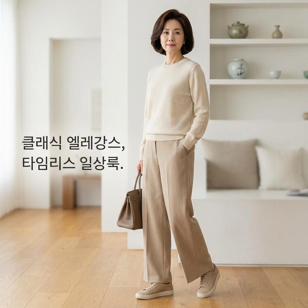 4060 데일리룩 정석으로 불리는 기본 아이템은 '베이지 슬랙스'입니다. 어떤 상의와도 잘 어울리며, 특히 뉴트럴 톤의 운동화와 매치했을 때 가장 우아하고 고급스러운 분위기를 자아냅니다. 유행을 타지 않아 한 번 구매하면 몇 년은 든든한 효자 아이템입니다.