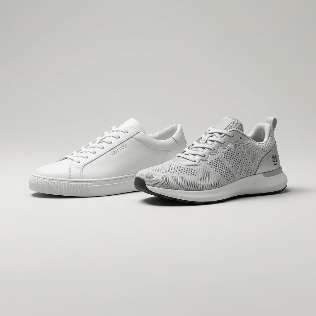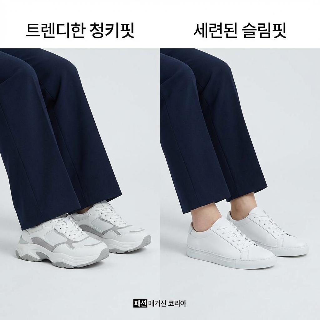 바지 통이 넓은 운동화에 어울리는 정장바지를 입을 때는 운동화의 '앞코' 모양이 중요합니다. 앞코가 너무 둥글고 뭉툭하면 자칫 둔해 보일 수 있으니, 살짝 슬림하게 빠진 쉐입을 선택하세요. 시각적으로 발끝까지 라인이 이어져 키가 훨씬 커 보이는 효과가 있습니다.
