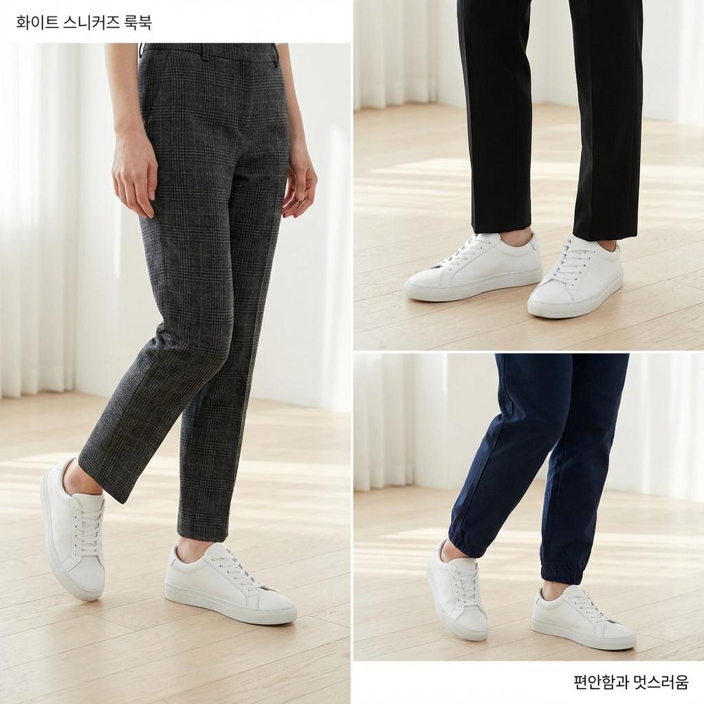 A: 캔버스 소재보다는 천연 가죽 소재의 심플한 화이트나 베이지 운동화를 선택하세요. 로고가 크지 않은 미니멀한 디자인은 정장 슬랙스와 매치했을 때 훨씬 고급스러운 느낌을 줍니다.