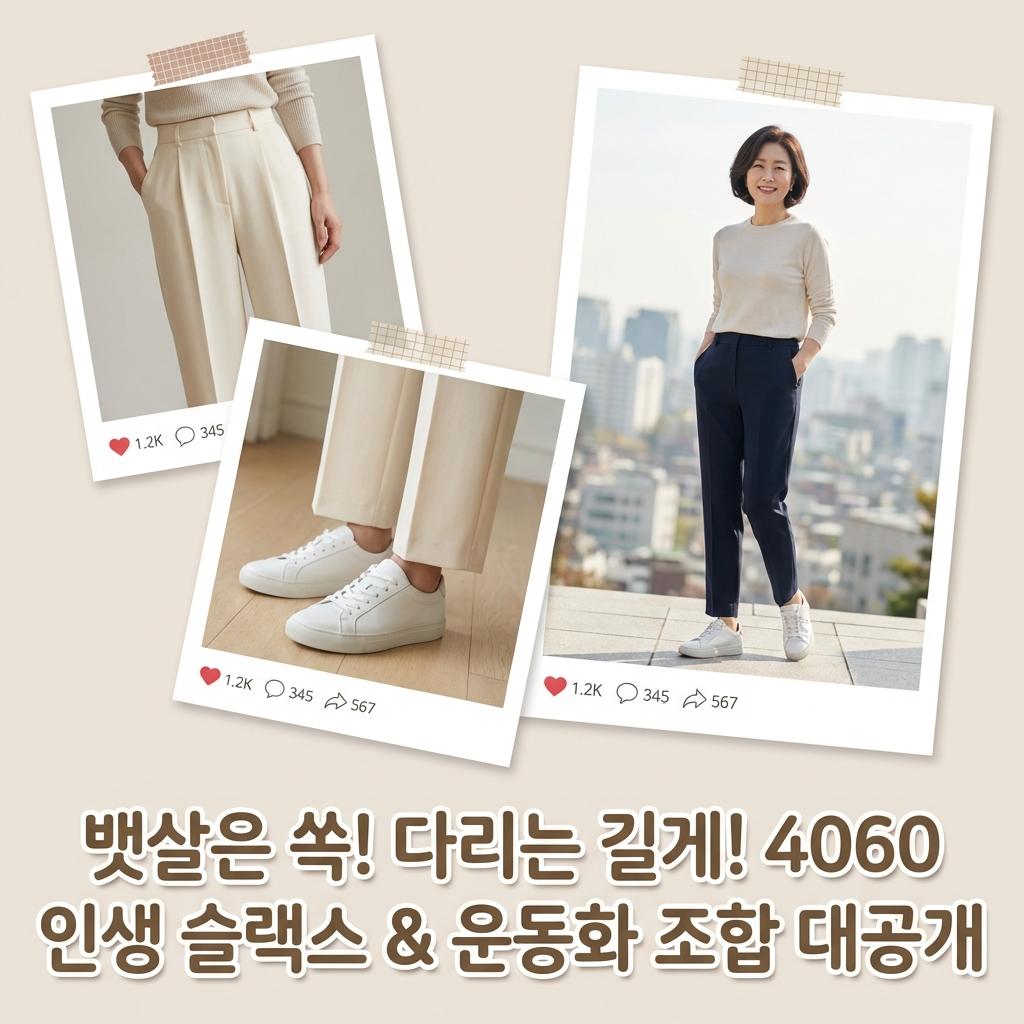 40대 50대 60대 여성분들의 뱃살 고민을 해결하는 체형 보정 슬랙스와 발 편한 운동화 매칭 노하우를 공개합니다. 아줌마 소리 듣지 않는 세련된 시니어 패션 스타일링과 백화점 브랜드 추천까지, 지금 바로 확인하고 우아한 패션을 완성하세요. 뱃살은 쏙! 다리는 길게! 4060 인생 슬랙스 & 운동화 조합 대공개