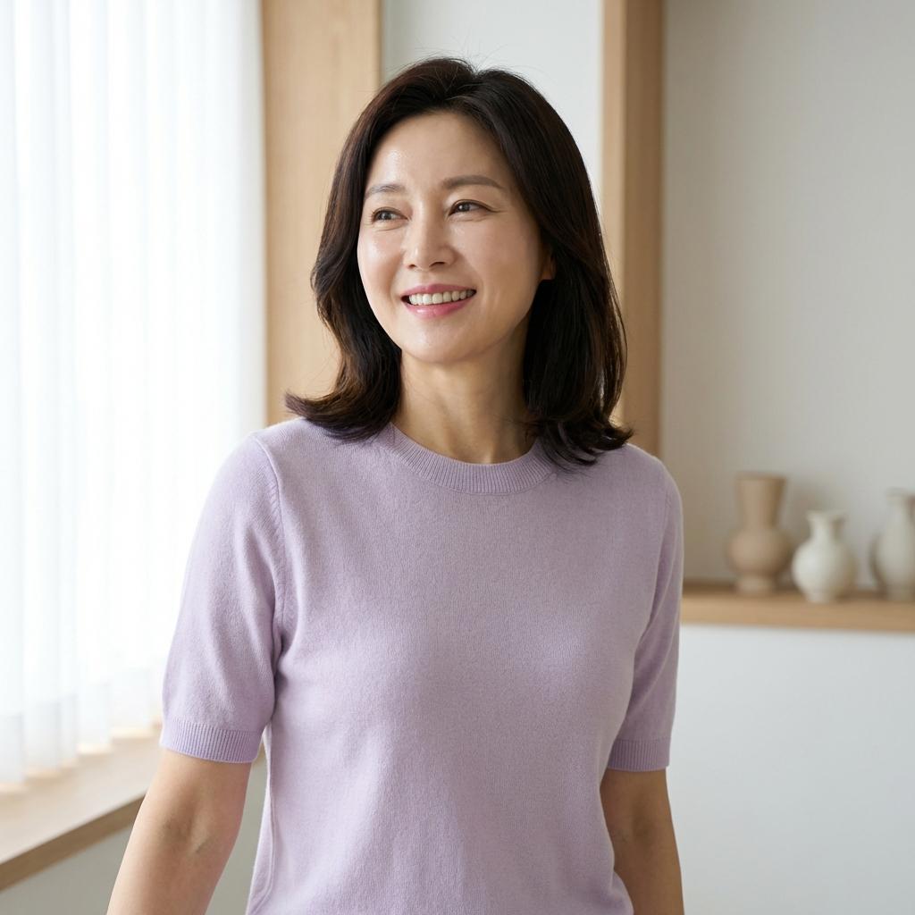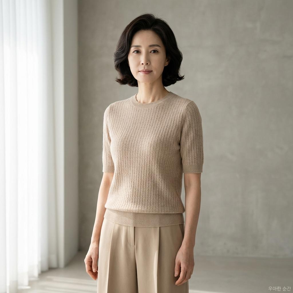 이러한 체형 고민을 해결하면서도 중년의 우아함을 극대화할 수 있는 아이템이 바로 반팔 니트 입니다. 적당한 두께감과 고급스러운 소재를 선택한다면 체형 보완은 물론, 격식 있는 자리에서도 빛나는 스타일을 완성할 수 있습니다.