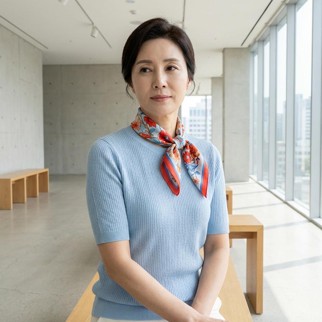 4월은 아침저녁으로 기온 차가 큽니다. 이때 반팔 니트 위에 봄 가디건 이너 로 입었던 니트를 단독으로 입으면서 목에 실크 스카프 를 가볍게 둘러주세요. 스카프는 목의 주름을 가려주는 동시에 시선을 위로 끌어올려 전체적인 비율을 좋아 보이게 만듭니다. 쁘띠 스카프를 매듭지어 연출하면 체온 유지와 우아함을 동시에 잡을 수 있습니다.