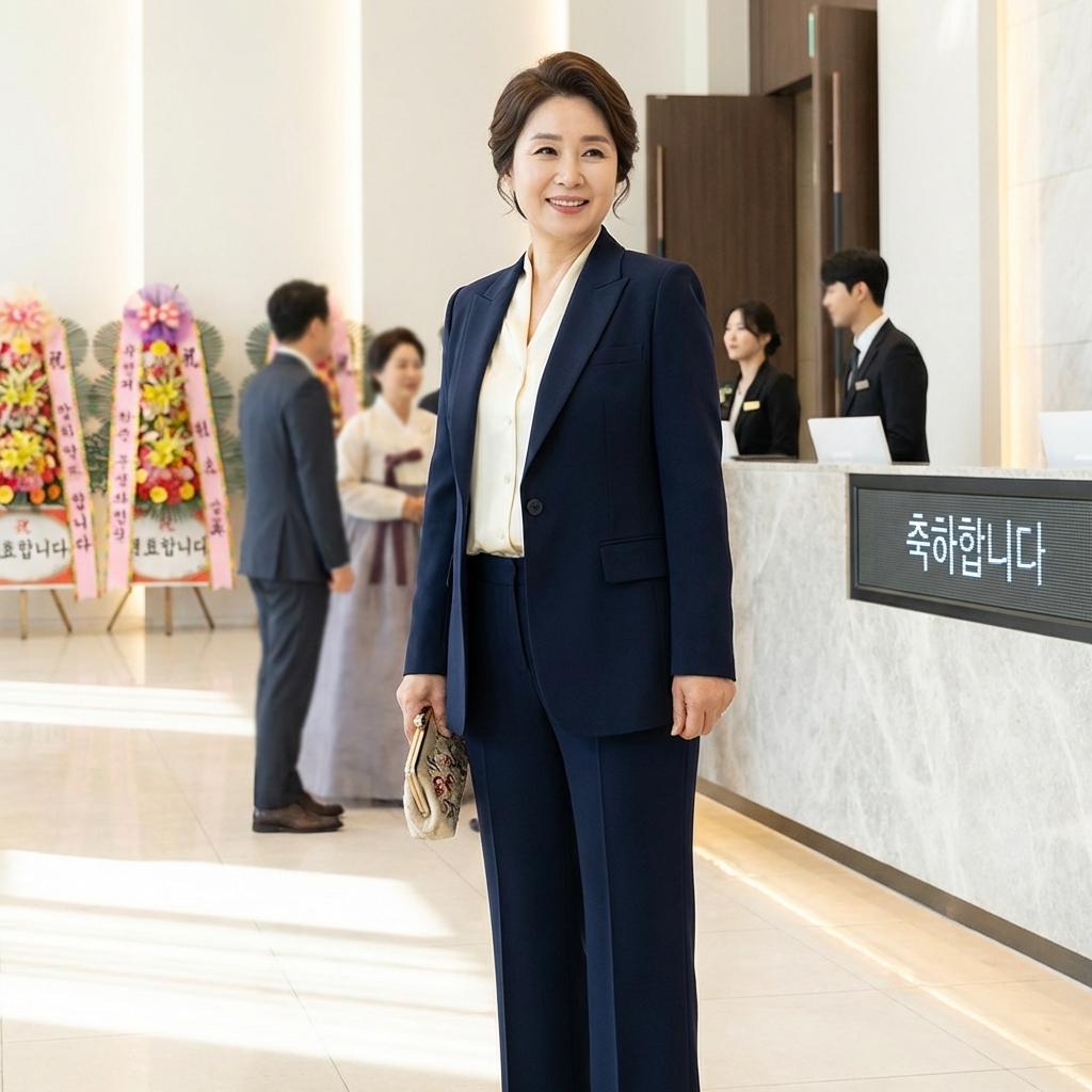 결혼식 같은 격식 있는 자리에서는 셋업 수트를 활용해 보세요. 상하의를 같은 색상으로 맞추면 시선이 끊기지 않아 키가 커 보입니다. 내부에는 밝은 색상의 블라우스를 입어 얼굴 안색을 살려주면 세련된 50대 통통한 체형 하객 패션 이 완성됩니다.