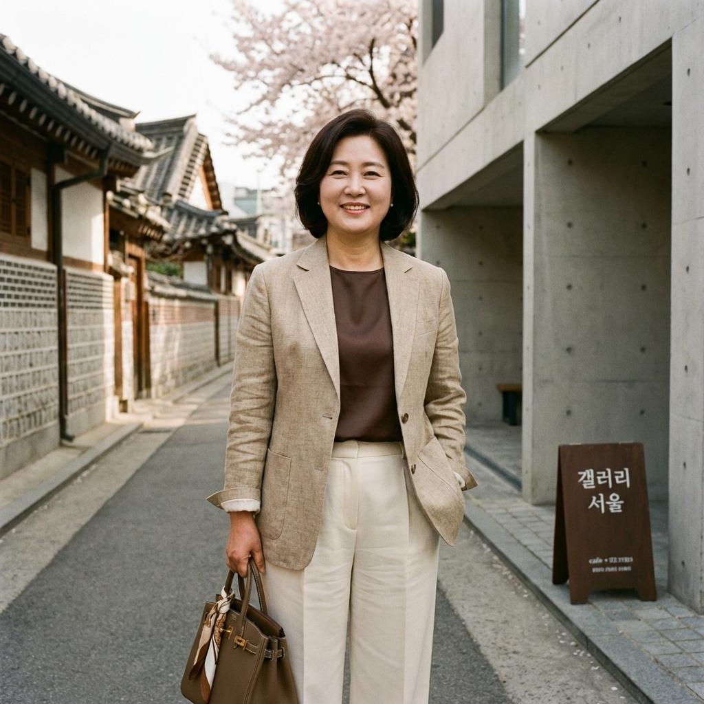 올봄에는 편안하면서도 우아한 '올드머니 룩'의 영향으로 베이지, 아이보리 등 차분한 컬러가 유행입니다. 통통한 체형이라 밝은색이 부담스럽다면, 베이지 자켓 안에 톤이 다른 브라운 이너를 매치하는 톤온톤 코디를 시도해 보세요. 훨씬 고급스러운 분위기를 풍깁니다.