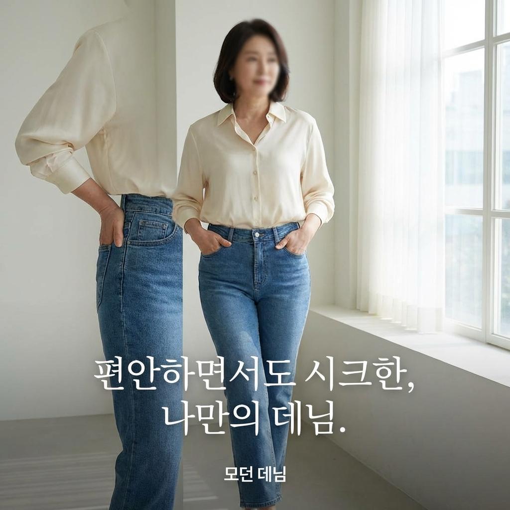 청바지는 신축성이 너무 좋은 레깅스 같은 소재보다는 어느 정도 두께감이 있는 데님을 고르세요. 색상은 중간 톤의 중청이나 생지 데님이 유행을 타지 않고 날씬해 보입니다. 밑위가 긴 하이웨이스트 디자인은 배를 감싸주어 편안함과 스타일을 동시에 만족시킵니다.