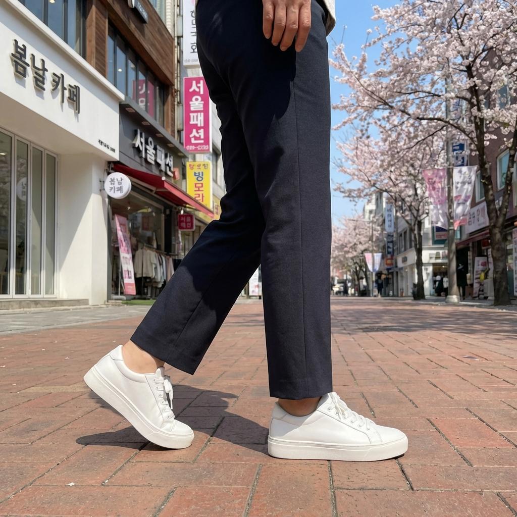 통통한 체형일수록 신발 선택이 중요합니다. 굽이 전혀 없는 플랫슈즈보다는 3cm 정도의 속굽이 있는 운동화나 로퍼를 선택하세요. 발목이 살짝 드러나는 9부 바지와 매치하면 다리가 훨씬 길어 보이며 활동성까지 잡을 수 있습니다.