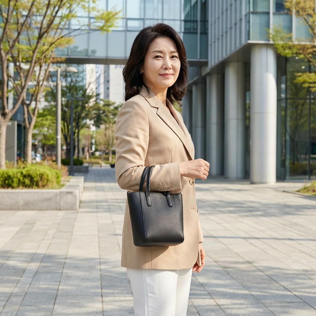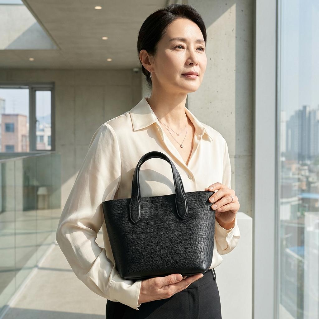 중년의 스타일에서 '각'은 곧 자기관리를 의미합니다. 내용물을 넣었을 때 형태가 무너지는 가방보다는, 탄탄하게 형태를 유지하는 여성 미니백 브랜드 제품을 추천합니다. 이런 토트백 추천 스타일은 격식 있는 자리에서도 당당한 애티튜드를 만들어줍니다.