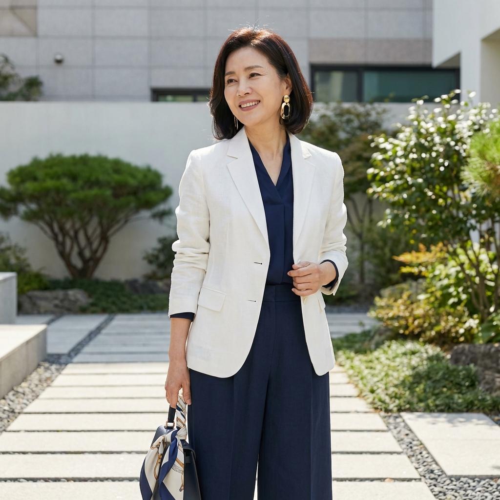 A3: 소재는 린넨이더라도 디자인이 테일러드 자켓 형태라면 충분히 격식 있어 보입니다. 여기에 진주 목걸이나 실크 스카프 하나만 더해주면 그 어떤 정장보다 고급스러운 50대 여성 여름 하객패션 이 완성됩니다.