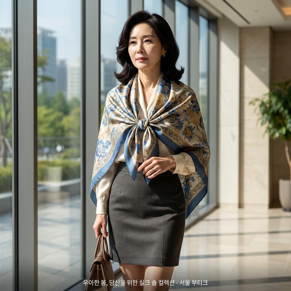 50대는 선명한 원색 계열이, 60대는 은은하면서도 화려한 파스텔 톤이나 금색 배색이 잘 어울립니다. 자신의 퍼스널 컬러에 맞는 스카프 하나가 열 가지 옷 부럽지 않은 효과를 줍니다.